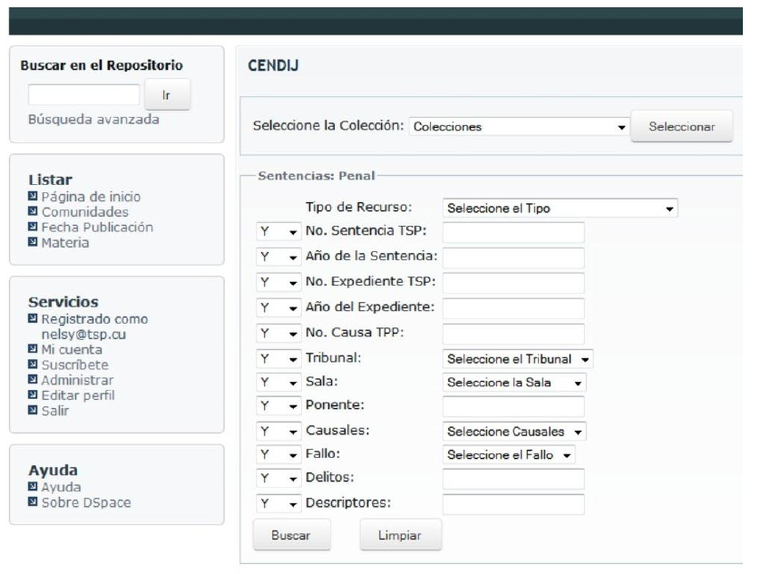- El Repositorio institucional contiene en formato digital Sentencias, Doctrina, Legislación, Disposiciones del Consejo de Gobierno del Tribunal Supremo Popular y otras informaciones de la rama del Derecho.