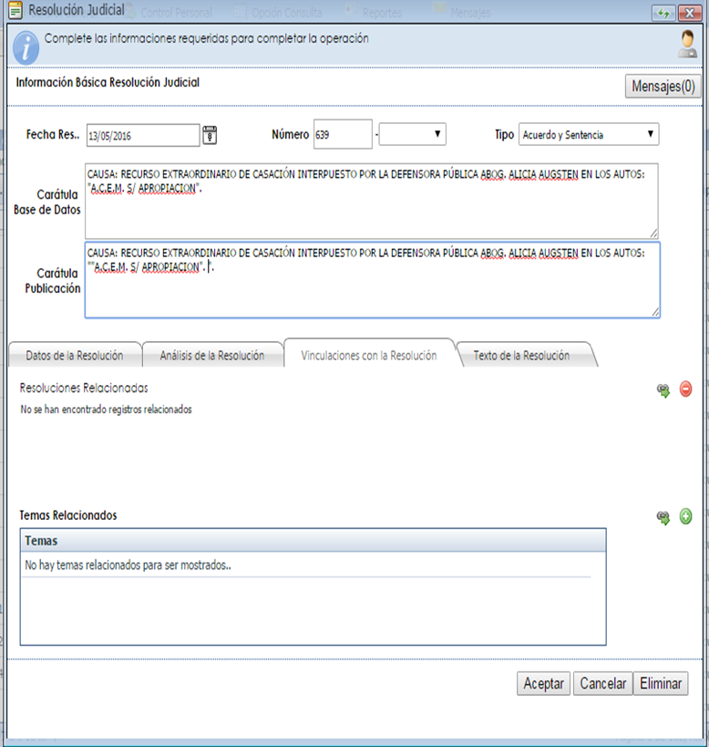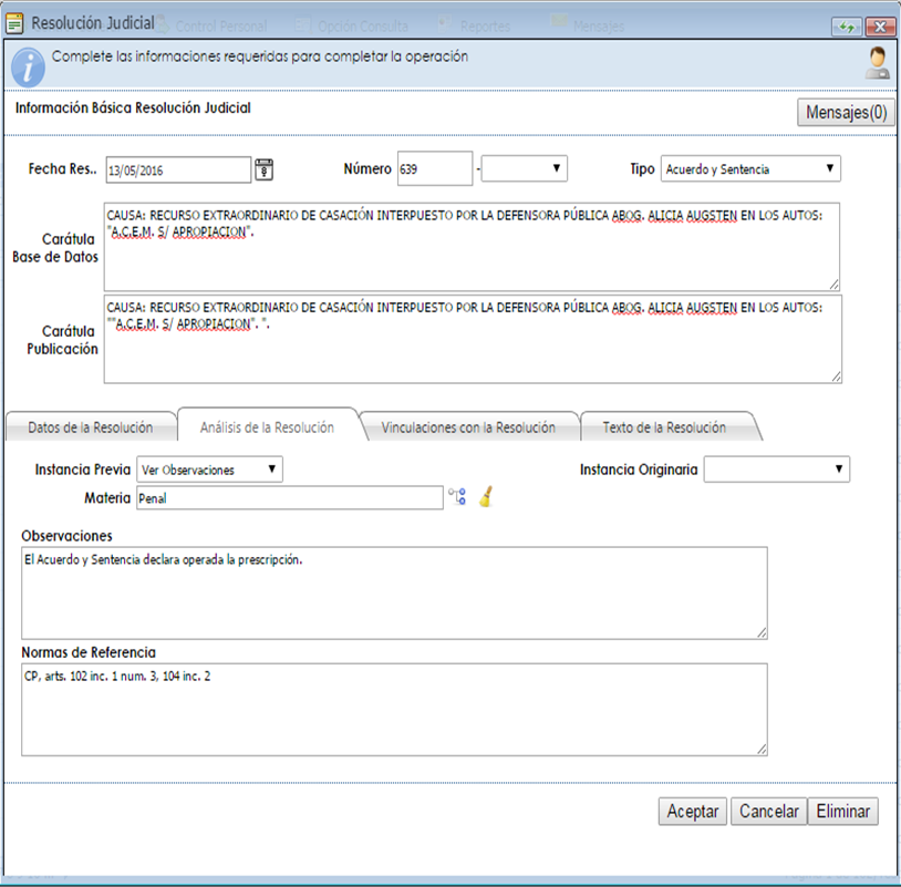 Art. 2º.- DISPONER que la Dirección de Tecnología y Comunicación, arbitre los medios necesarios para que una vez finalizado el proceso mencionado en el artículo anterior, la Resolución pase automáticamente a la Base de Datos de Jurisprudencia de la División de Investigación, Legislación y Publicaciones del Centro Internacional de Estudios Judiciales, a efecto de su análisis y publicación en la Página Web de Consulta de Jurisprudencia de la Corte Suprema de Justicia.